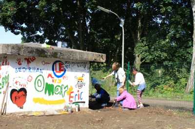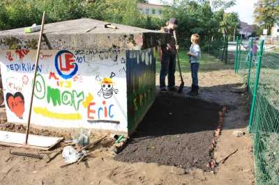 Nach erfolgreichem Abschluss der Malaktion wurde die Front zum Fußweg den Kindern der Kinderwerkstatt zur Bepflanzung frei gegeben.